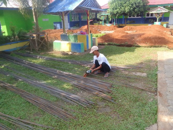 Tampak tukang sedang memotong besi 10 inch dan membuat cincin untuk rangka besi untuk pondasi cakar ayam. Proses pengerjaan ini menunjukkan bahwa pembangunan musholla sedang berjalan dengan baik. Bapak Irman menjelaskan bahwa progres pembangunan Musholla Al Ikhlas MIN 1 Merangin tahap 1 sudah mencapai 45% pengerjaan.