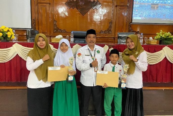 Merangin, HUmas MIN 1 Merangin : Siswa MIN 1 Merangin, Sayna Alifa dan Abid Aqila Pratama, merasa senang dan bahagia setelah menjadi juara Olimpiade Madrasah Indonesia (OMI) senin 29 September 2025. Kebahagiaan mereka semakin lengkap dengan didampingi oleh kepala MIN 1 Merangin, Bapak Saidi Muzakkir, S.Pd.I, dan 2 guru pendamping, Ibu Misnawati, S.Pd.I dan Ibu Putri Ramadhani, S.Pd.