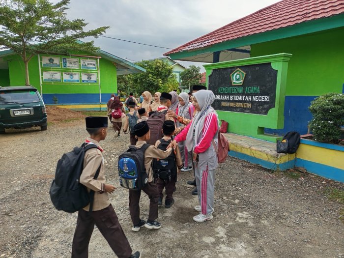 Guru dan mahasiswa praktek dari Universitas Merangin berbaris di depan gerbang madrasah, menyambut siswa dengan senyum dan sapaan hangat. Mereka berjabat tangan dan memberikan motivasi kepada siswa untuk memulai hari dengan penuh semangat.
