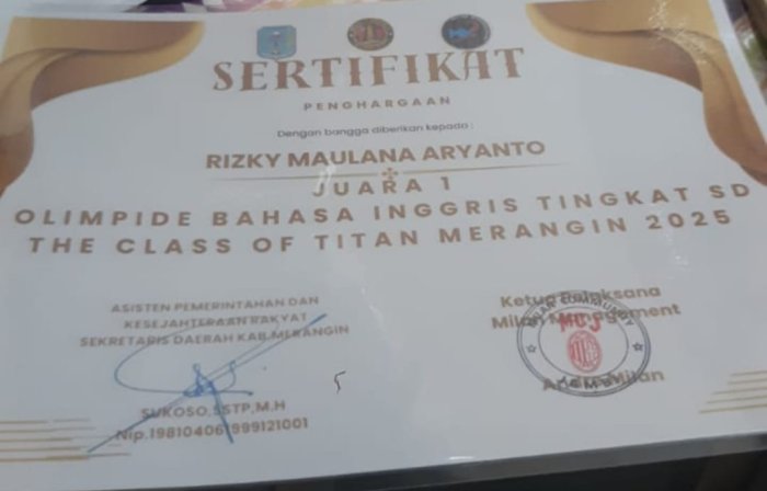 Rizky Mauliana Aryanto, yang dibimbing oleh wali kelasnya, Bapak Ade Murja, S.Pd.I, berhasil menunjukkan kemampuan luar biasanya dengan meraih juara 1 The Class Of Titan Merangin 2025 pada Olimpiade Bahasa Inggris. Selain itu, ia juga meraih juara 3 pada bidang studi IPAS dan Matematika.